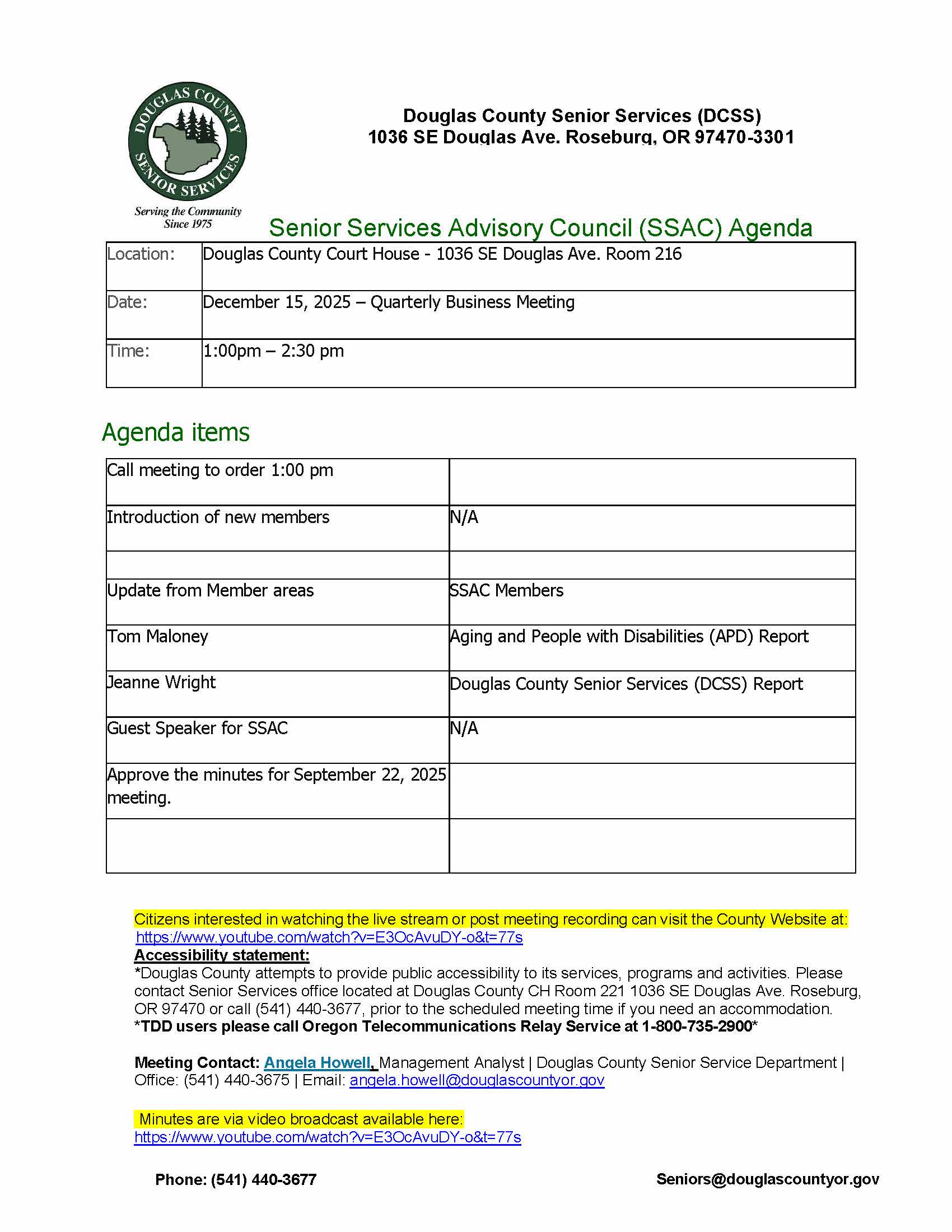 For additional information about this meeting, please contact the Douglas County Senior Services by calling (541) 440-3677 or email at seniors@douglascountyor.gov. The meeting agenda is attached and can also be found at https://douglascountyor.gov/.