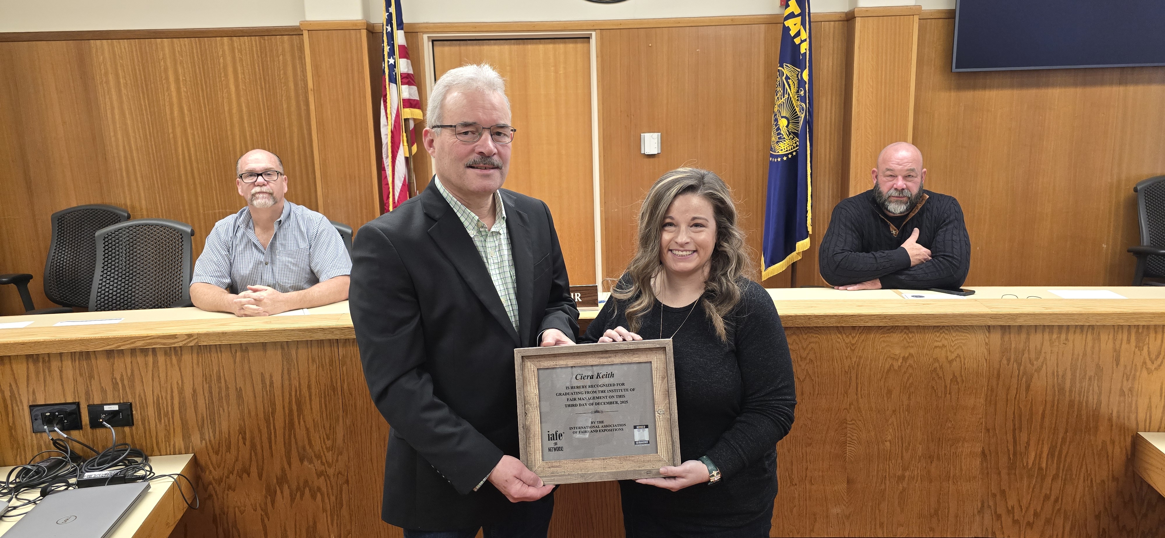 Commissioner Tom Kress, liaison Commissioner for the Douglas County Fairgrounds honored Ciera Keith for recently graduating from the Institute of Fair Management during the 2025 International Association of Fairs and Expositions (IAFE) Convention and Trade Show in Denver, Colorado in December 2025. Established in 2007, the Institute of Fair Management provides industry professionals and volunteers with comprehensive training across the core competencies essential to producing today’s agricultural fairs. The program includes coursework in management, risk management, marketing, programming, operations, and year-round facility usage.