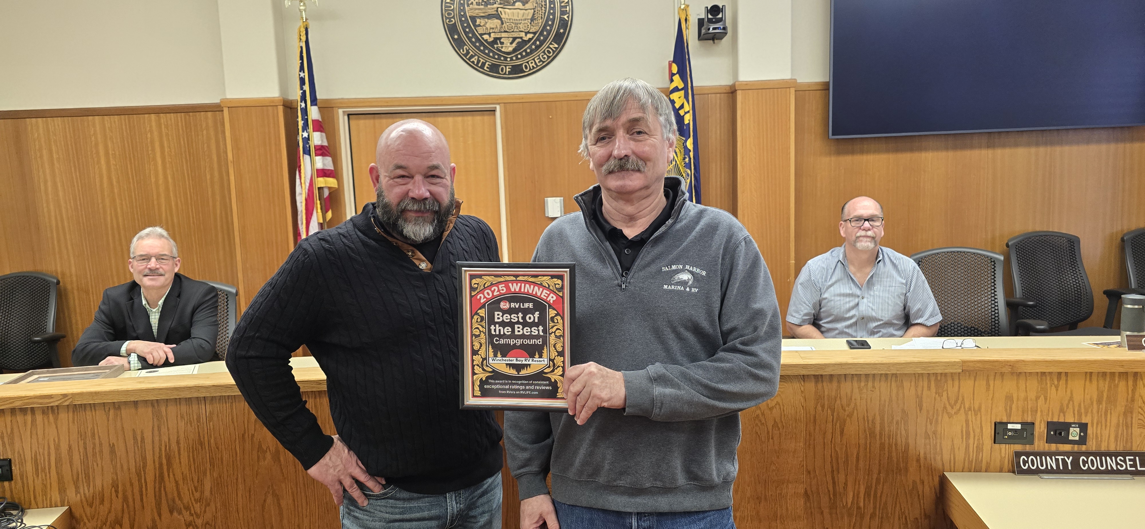 Commissioner Chris Boice, liaison Commissioner for Douglas County’s Salmon Harbor Department recognized Jim Zimmer and staff at Douglas County’s Salmon Harbor Division for our – Winchester Bay RV Resort being named one of RV Life’s “Best of the Best” Campgrounds for 2025, placing Douglas Countys Winchester Bay RV Resort in the top 25% of more than 20,000 campgrounds across North America. This honor is based entirely on verified guest reviews, making it a true reflection of visitor satisfaction.
