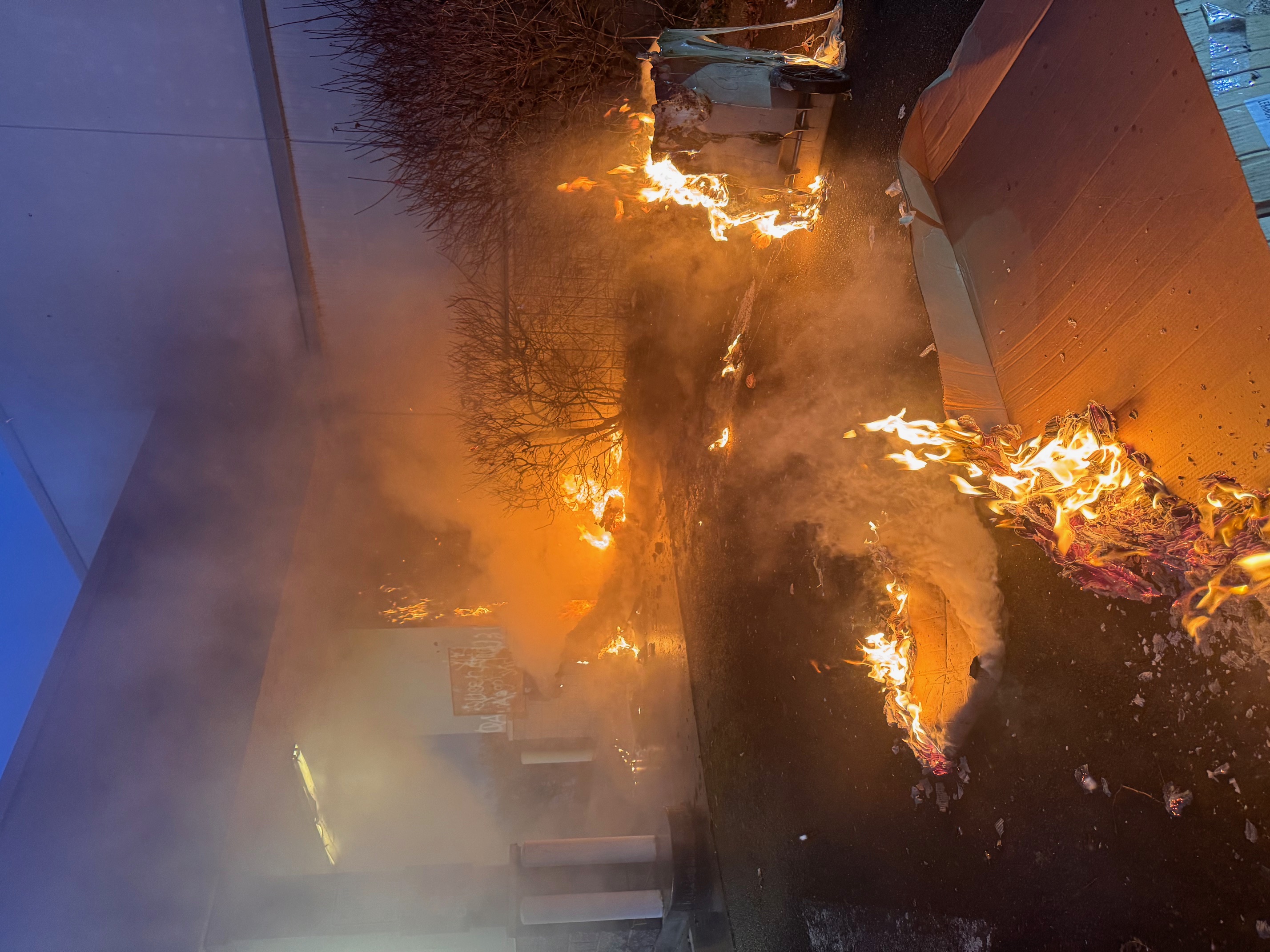 When the first engine arrived, they quickly went to work containing the fire that was running up the outside of the building, keeping it from getting bigger and from getting inside, while other firefighters were extinguishing the trash bins that were full of belongings used as storage containers and the bushes near the building. The districts ladder truck arrived moments later with off duty personnel and used the ariel ladder to gain access to the roof, those crews also made a thorough search of the building after breaching the doors using tools to get in. Firefighters found no fire or people in the building and crews were able to secure the fire sprinkler system until repairs could be made. No injuries were reported and the fire likely started from the unhoused using the area around the bushes for sleeping.