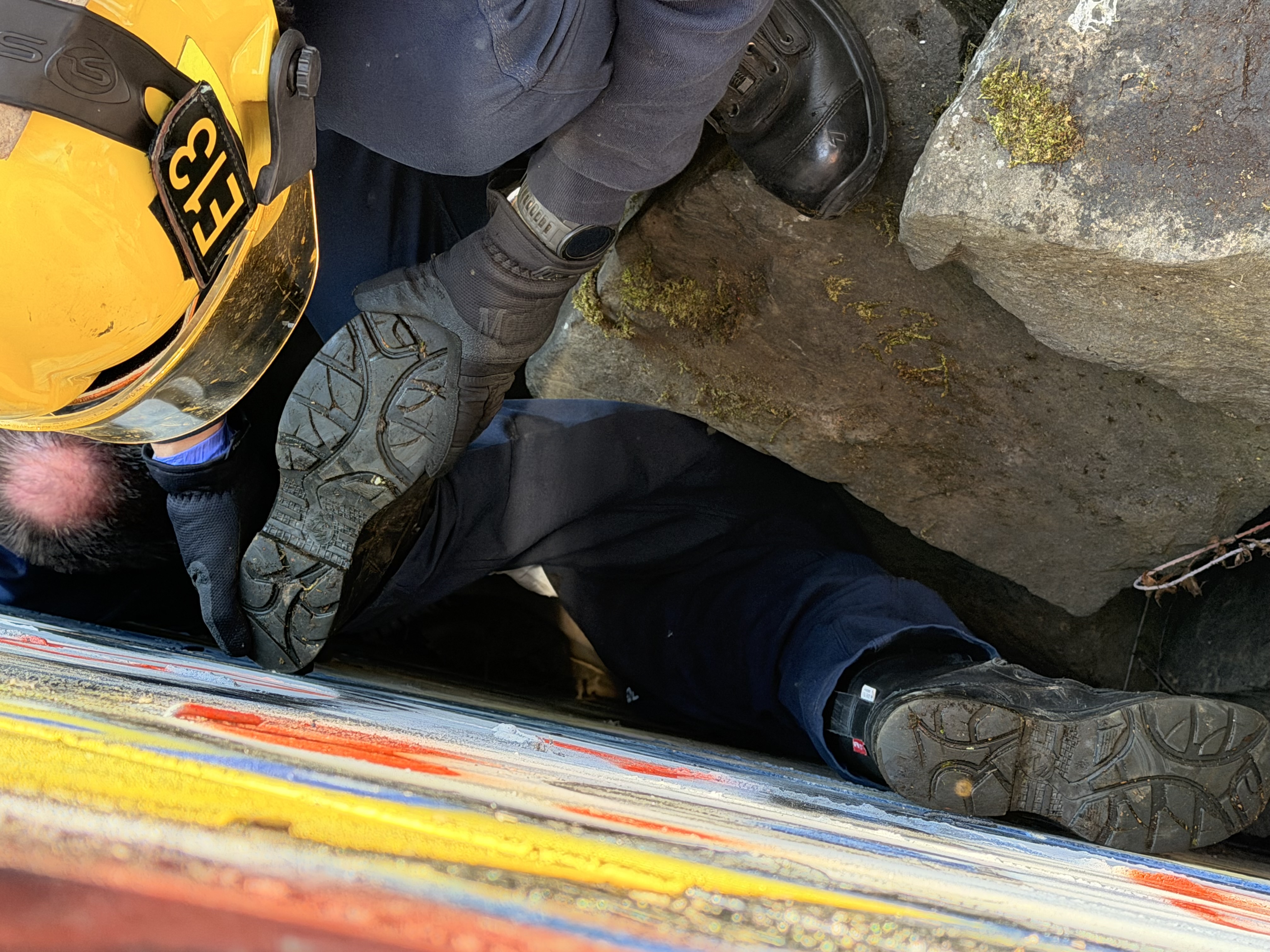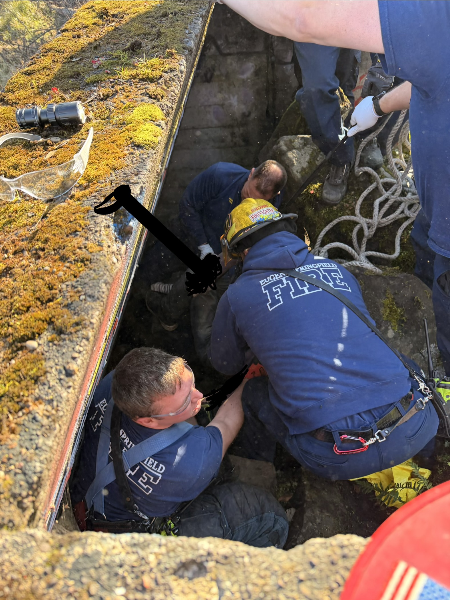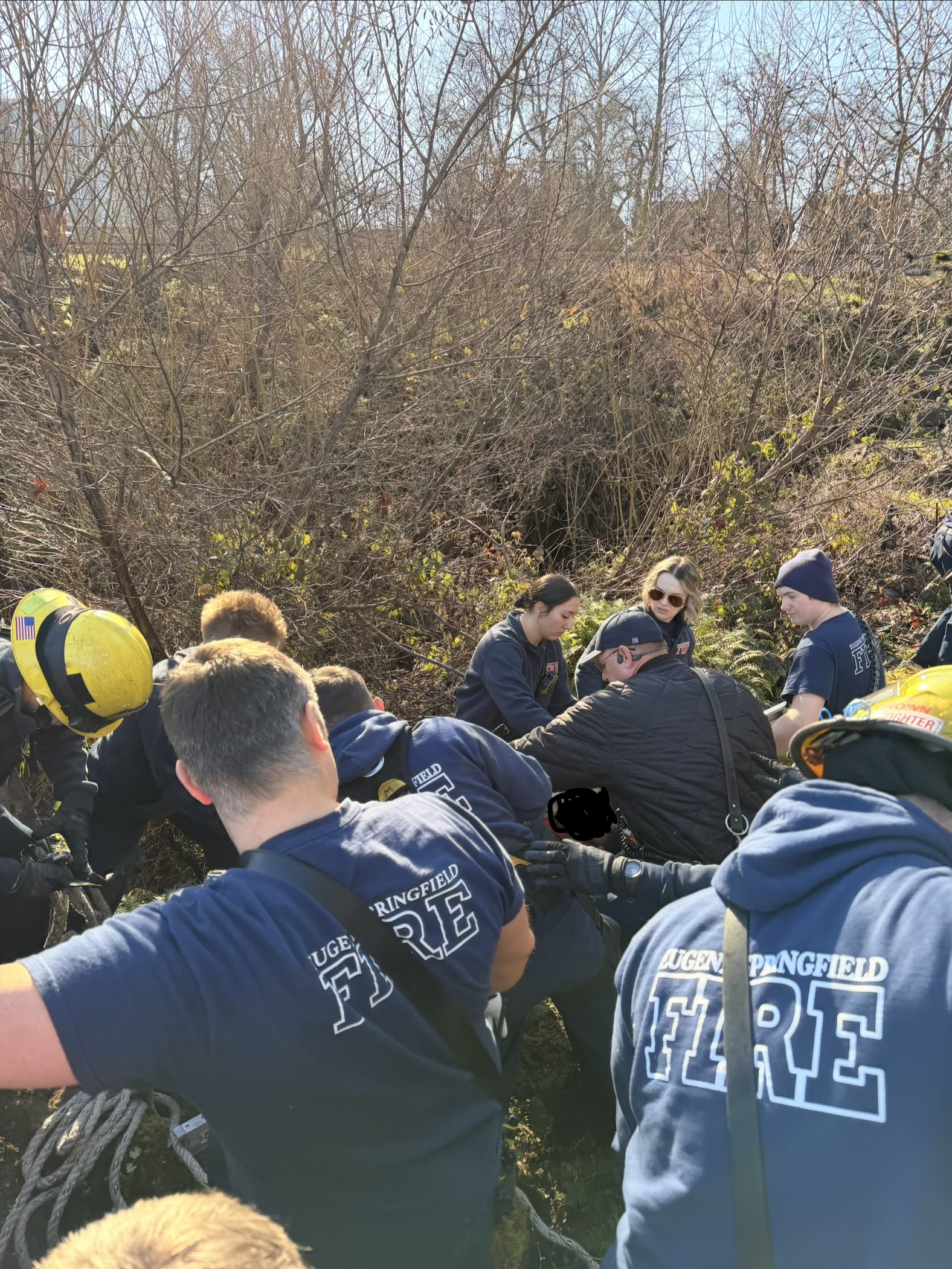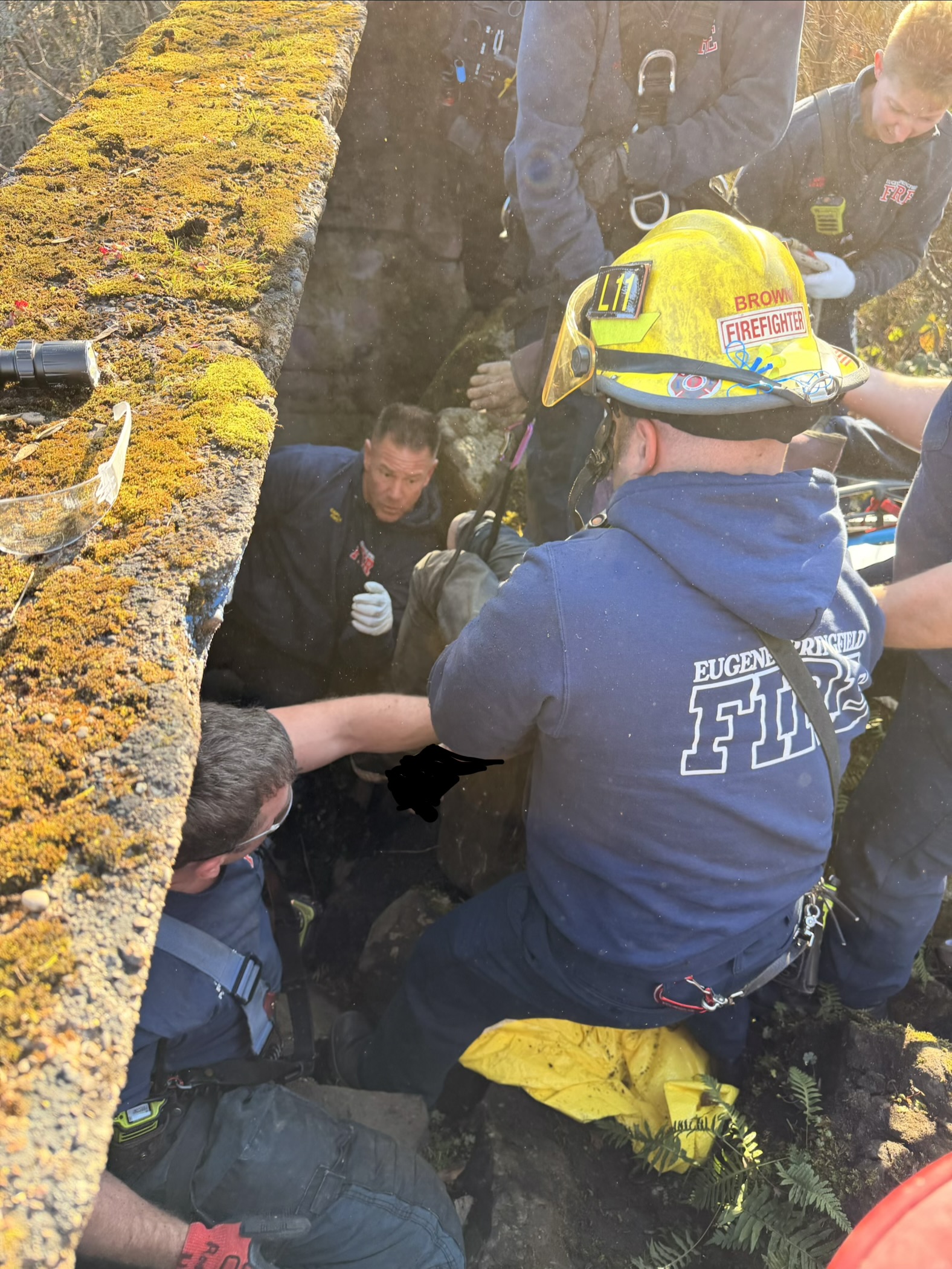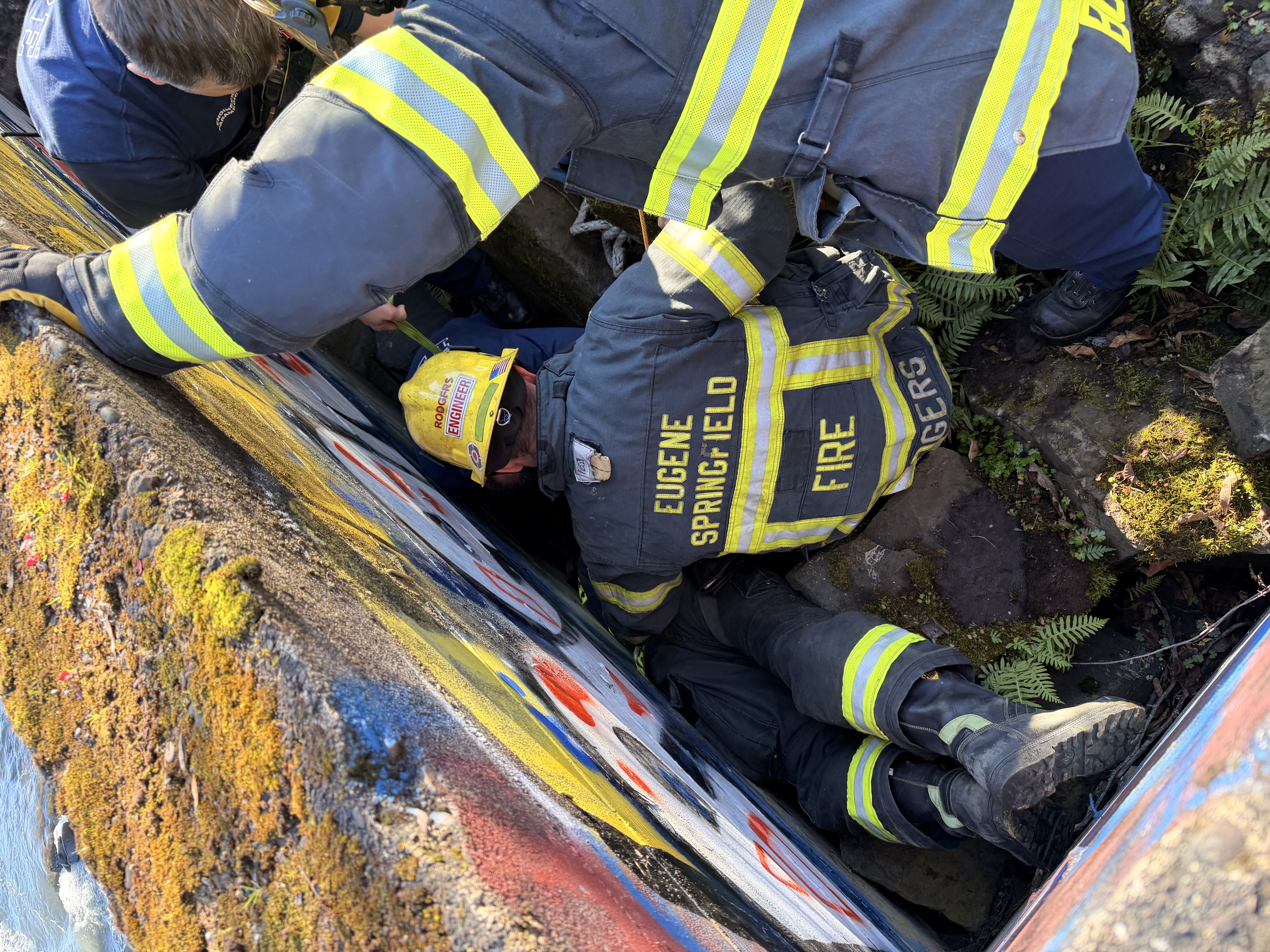 Eugene, OR. Eugene Springfield Fire responded to an unusual rescue operation on near the University of Oregon Sunday afternoon. Just 12PM on January 18th, ESF crews were called to a possible cardiac arrest in the area of 2000 Garden Ave in Eugene. Bystanders walking along a Willamette River diversion, noticed a person 10-15’ down a crevice and called 911. Arriving crews found an unresponsive individual pinned between a concrete diversion wall and large quarry stone. Several crews with a total of 20 personnel responded for staffing and specialty equipment to aid in the rescue. In all it took about one hour to remove the victim and transport them to RiverBend. The victim a mid 30‘s male was transported in critical condition with a body temp of 76 degrees. If not for these attentive bystanders, the victim would not have survived much longer.