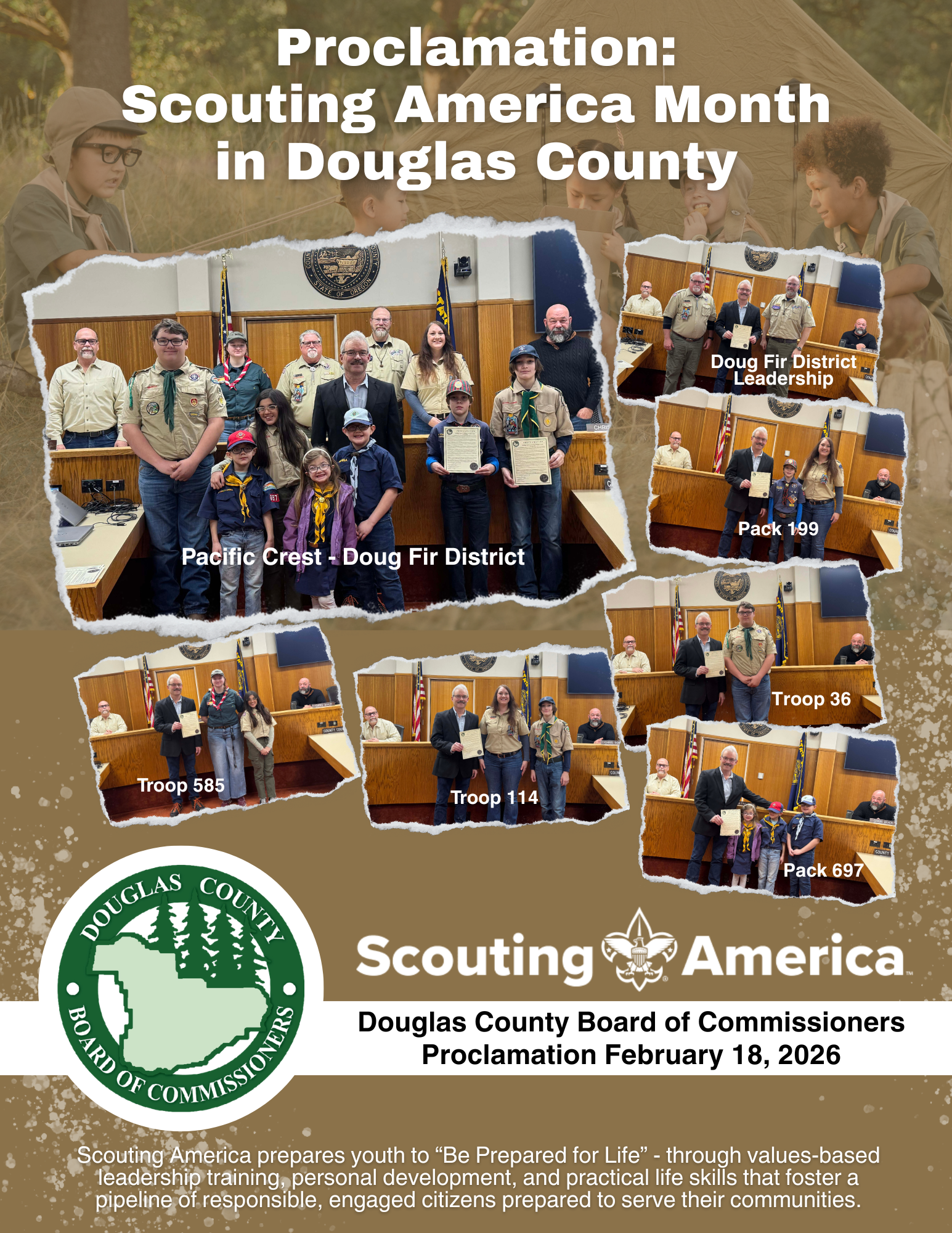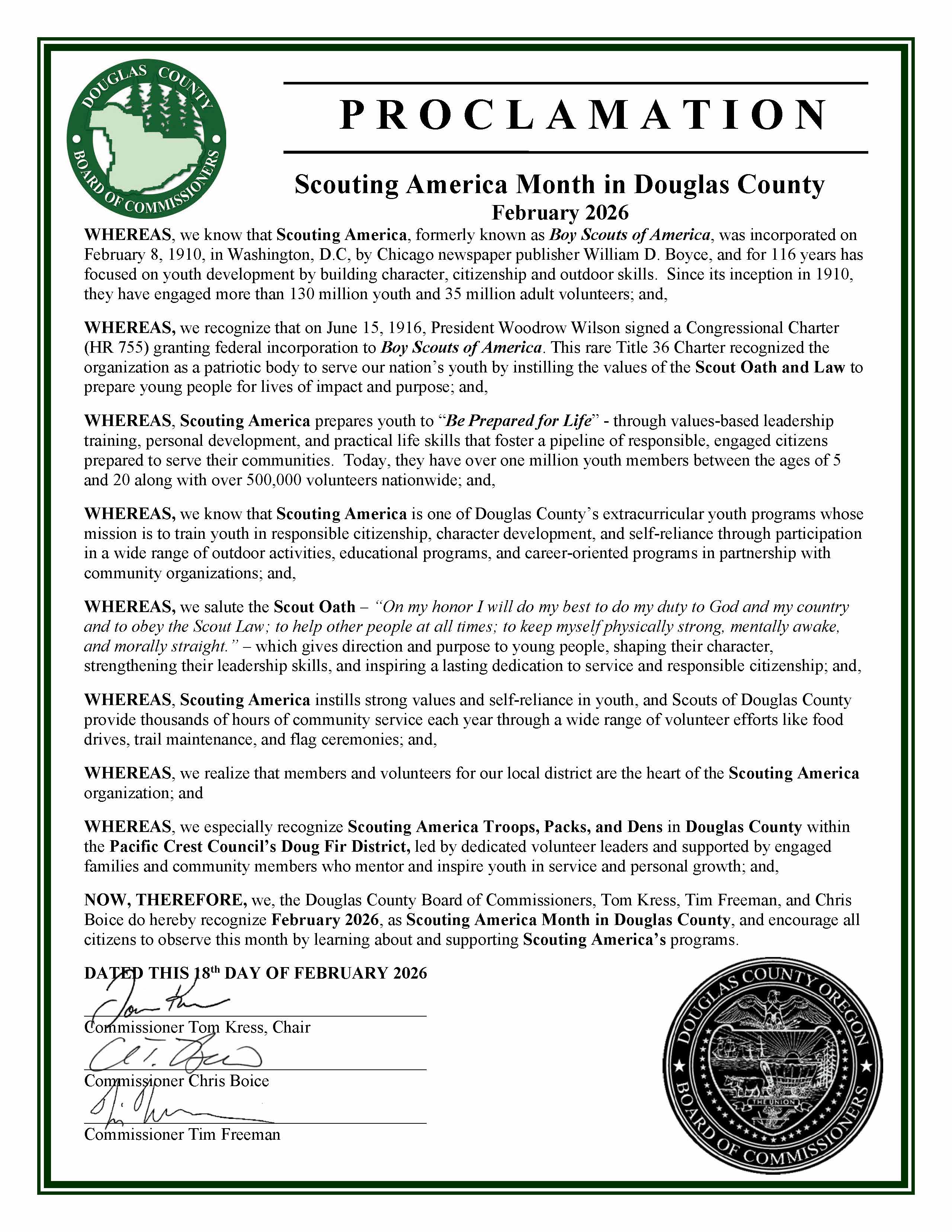 (Douglas County, Ore.) – Douglas County Commissioners Tom Kress, Chris Boice, and Tim Freeman issued a proclamation on Wednesday, February 18, 2026, at the Weekly Business Meeting calling upon all citizens of Douglas County to observe the month of February 2026 as Scouting America Month. Scouting America, formerly known as Boy Scouts of America, was incorporated on February 8, 1910, in Washington, D.C, by Chicago newspaper publisher William D. Boyce, and for 116 years has focused on youth development by building character, citizenship and outdoor skills. Since its inception in 1910, they have engaged more than 130 million youth and 35 million adult volunteers. A copy of the video presentation can be found on the Douglas County Government Facebook page: https://www.facebook.com/DouglasCountyeGovernment, as well as on Douglas County’s YouTube Channel at https://www.youtube.com/watch?v=c-565_6S9VE&t=818s.