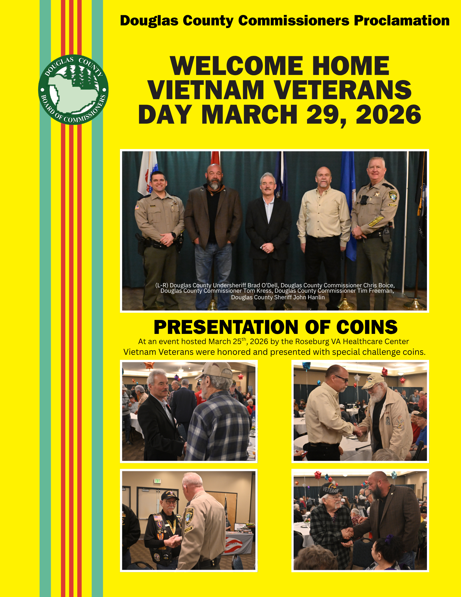 The Douglas County Board of Commissioners proclamation was presented by Board Chair Commissioner Tim Freeman, on behalf of all three commissioners and proclaimed Sunday, March 29, 2026, as Welcome Home Vietnam Veterans Day in Douglas County. They continue to honor with somber reflection the United States of America’s 13-year Commemoration of the 50th Anniversary of the Vietnam War which concluded in 2025. The proclamation encouraged all citizens to rightfully honor and thank our Vietnam Veterans and their families for their bravery, courageous military service, and sacrifice. During the reading copies of the proclamation certificates were presented to Vietnam Veterans in attendance.