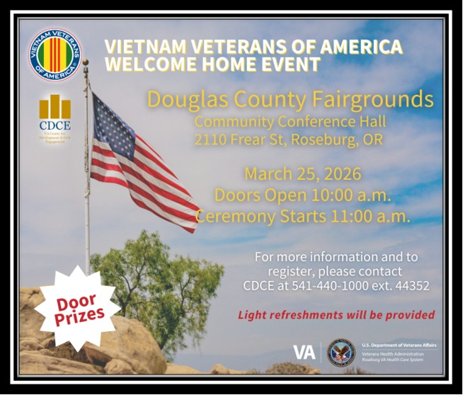 The Vietnam Veterans of America Welcome Home Event concluded with a door prize drawing and a sincere message from Palmer. The Commissioners truly and sincerely Thank and Welcome Home our Vietnam Veterans. The Douglas County Commissioners would like to thank the Roseburg VA for inviting them to be part of this amazing ceremony honoring our Vietnam Veterans.