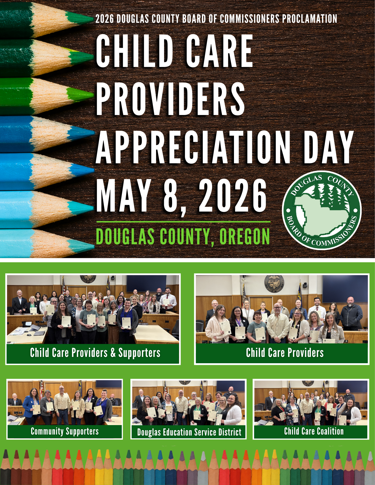 (Douglas County, Ore.) – Douglas County Board of Commissioners Tom Kress, Chris Boice, and Tim Freeman were pleased to issue a proclamation in honor of National Child Care Provider Appreciation Day during their weekly business meeting on Wednesday, April 22, 2026. The proclamation recognized that observing this day offers an important opportunity to express gratitude to childcare educators, teachers, centers, and home-based caregivers in Douglas County, across the United States, and around the world. These professionals are dedicated to creating safe, nurturing, and enriching environments where children can learn, grow, and thrive. It also highlighted the vital role childcare professionals play in fostering children’s cognitive, social, and emotional development, helping prepare them for success in school and in life. Additionally, they are an essential part of Douglas County’s workforce, economy, and community infrastructure, supporting economic stability by enabling businesses to retain employees and contributing to a productive, resilient local workforce. A copy of the live video from the presentation can be found on the Douglas County Government Facebook page at: https://www.facebook.com/DouglasCountyeGovernment.