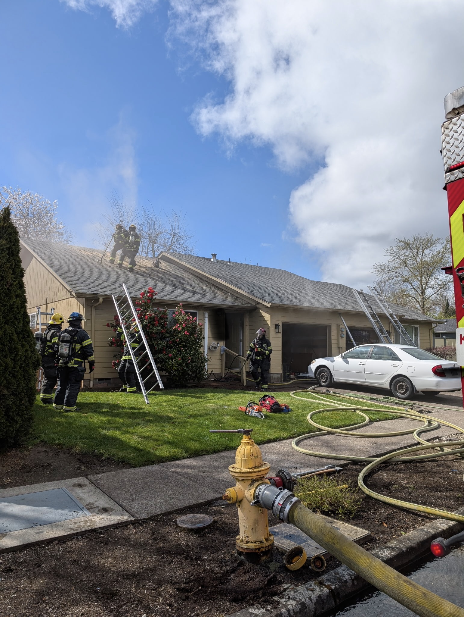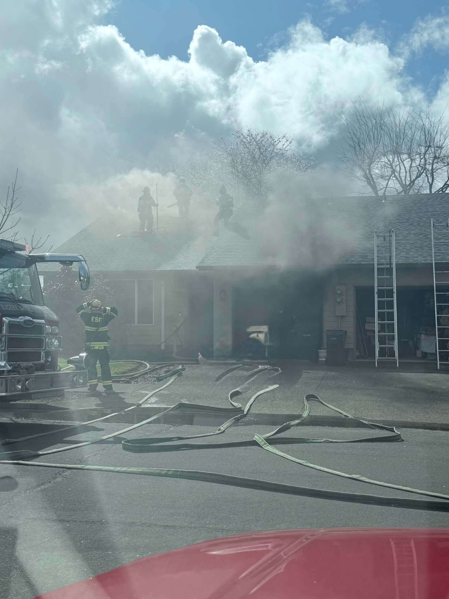 Eugene House Fire Sends One To The Hospital In Serious Condition (Photo)Eugene, OR. Eugene Springfeild Fire responded to a house fire in West Eugene Wednesday Morning. Just before 11:30AM on March 25th, firefighters were called to a duplex in the 4400 block of Marcum Ln. Callers reported heavy black smoke from one side of the duplex. Engine 8 from the Danebo Station arrived in about 3-1/2 minutes after the dispatch to find a working fire and immediately went to work addressing the fire located in the kitchen. Additional crew performed search and ventilation. One occupant was transported to a local hospital in serious condition. The cause is under investigation and there were no other injuries reported.