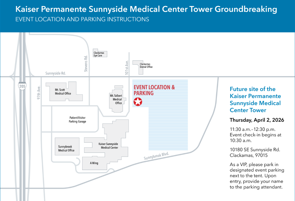 Location: Future site of the Kaiser Permanente Sunnyside Medical Center Tower (10180 S.E. Sunnyside Rd., Clackamas, Ore., 97015). As a media VIP, please park in designated event parking next to the tent. Upon entry, provide your name to the parking attendant. Map attached.