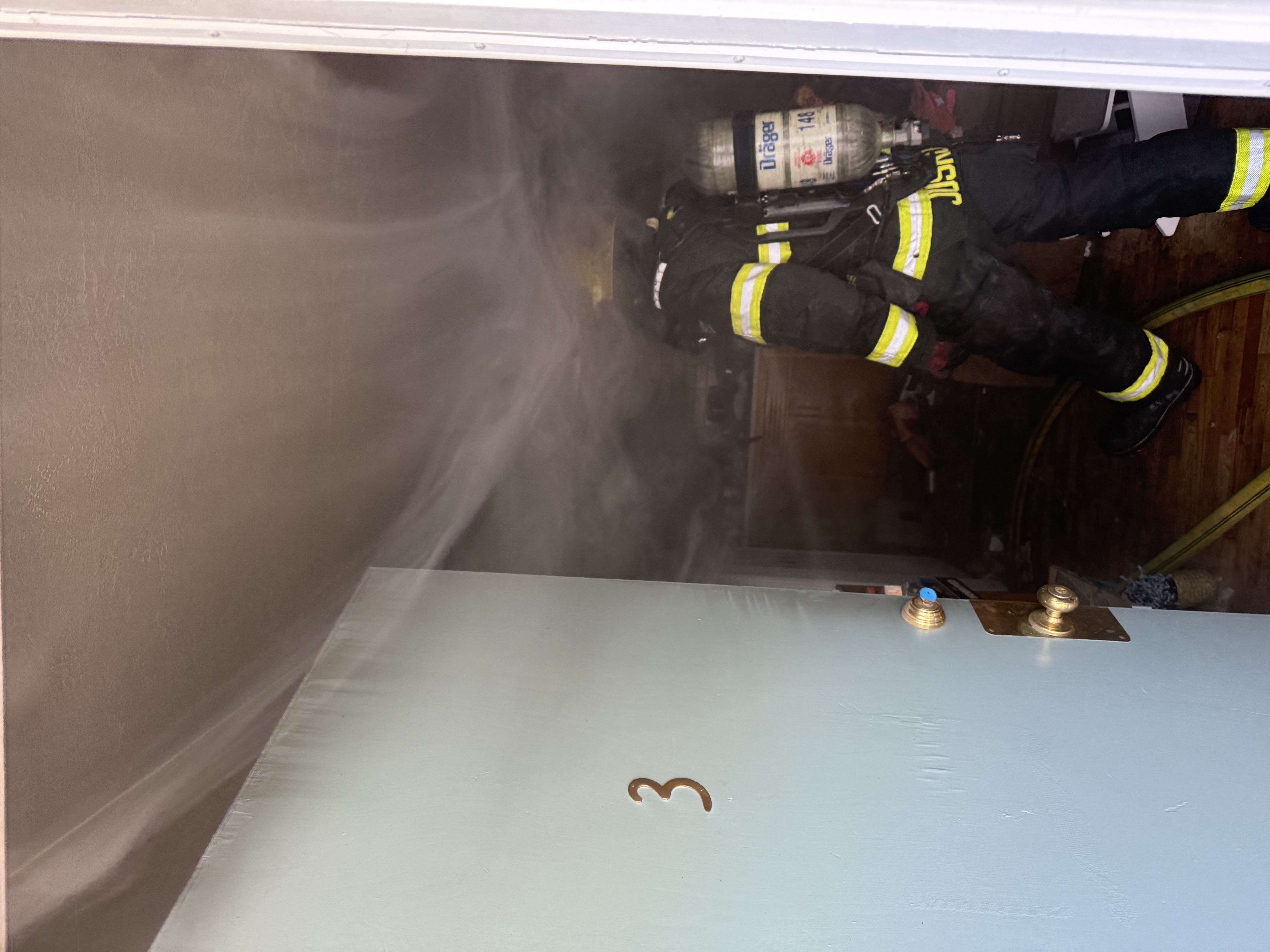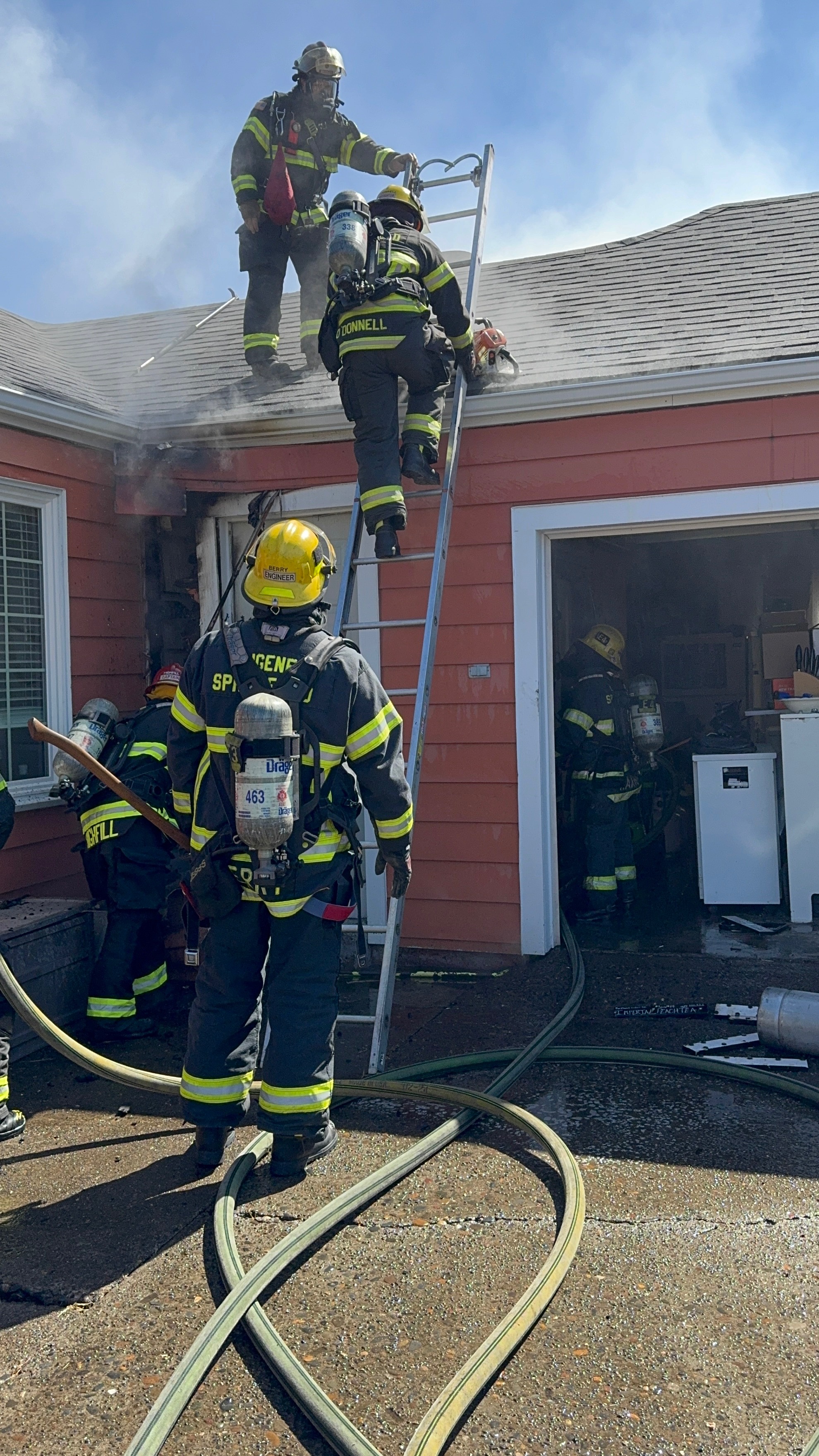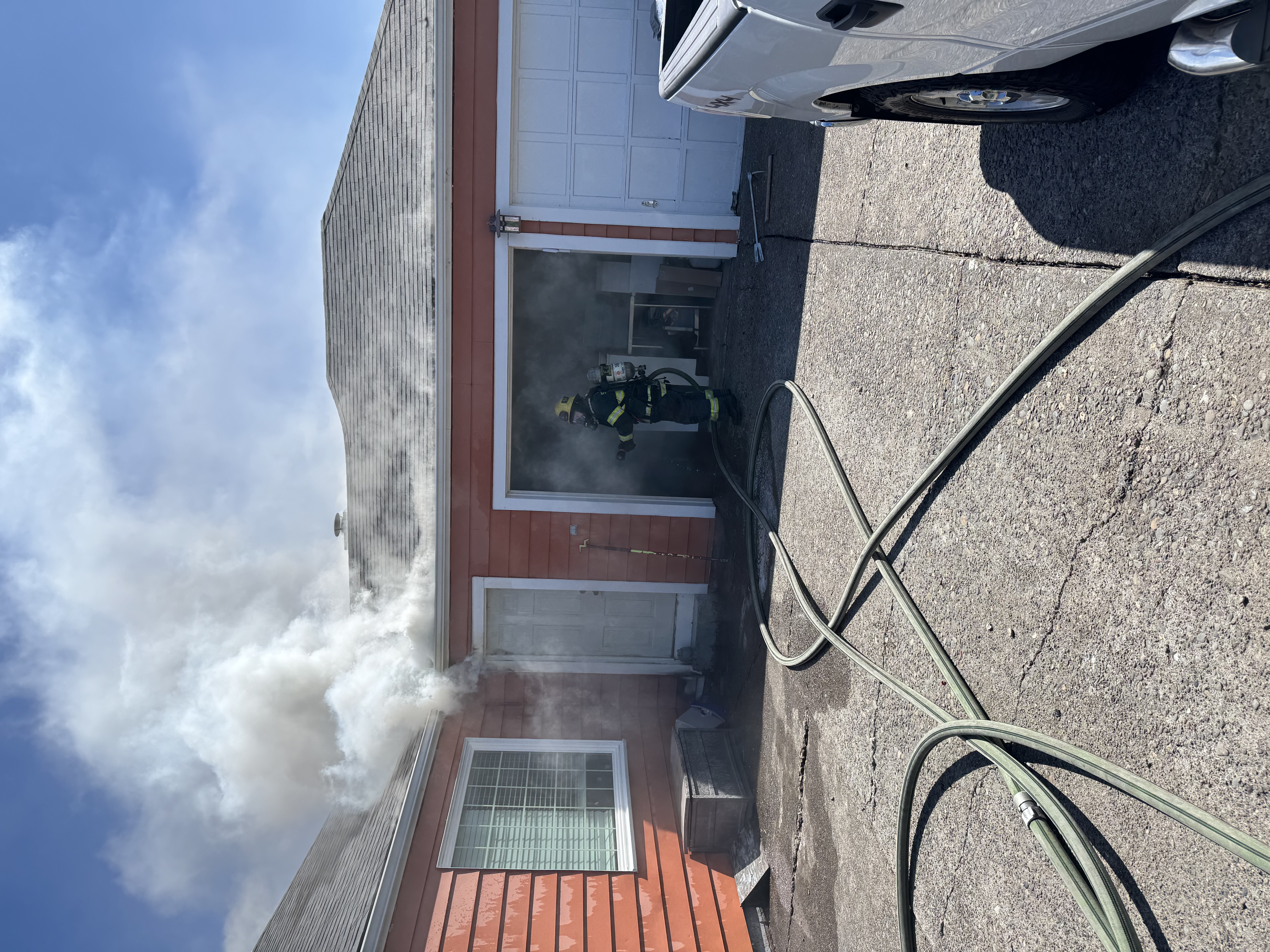 Engine 5 from the Gateway station arrived at 0359 and reported a working fire in the garage. The crew deployed a hose line for fire attack and search operations in the garage assisted by Engine 4.