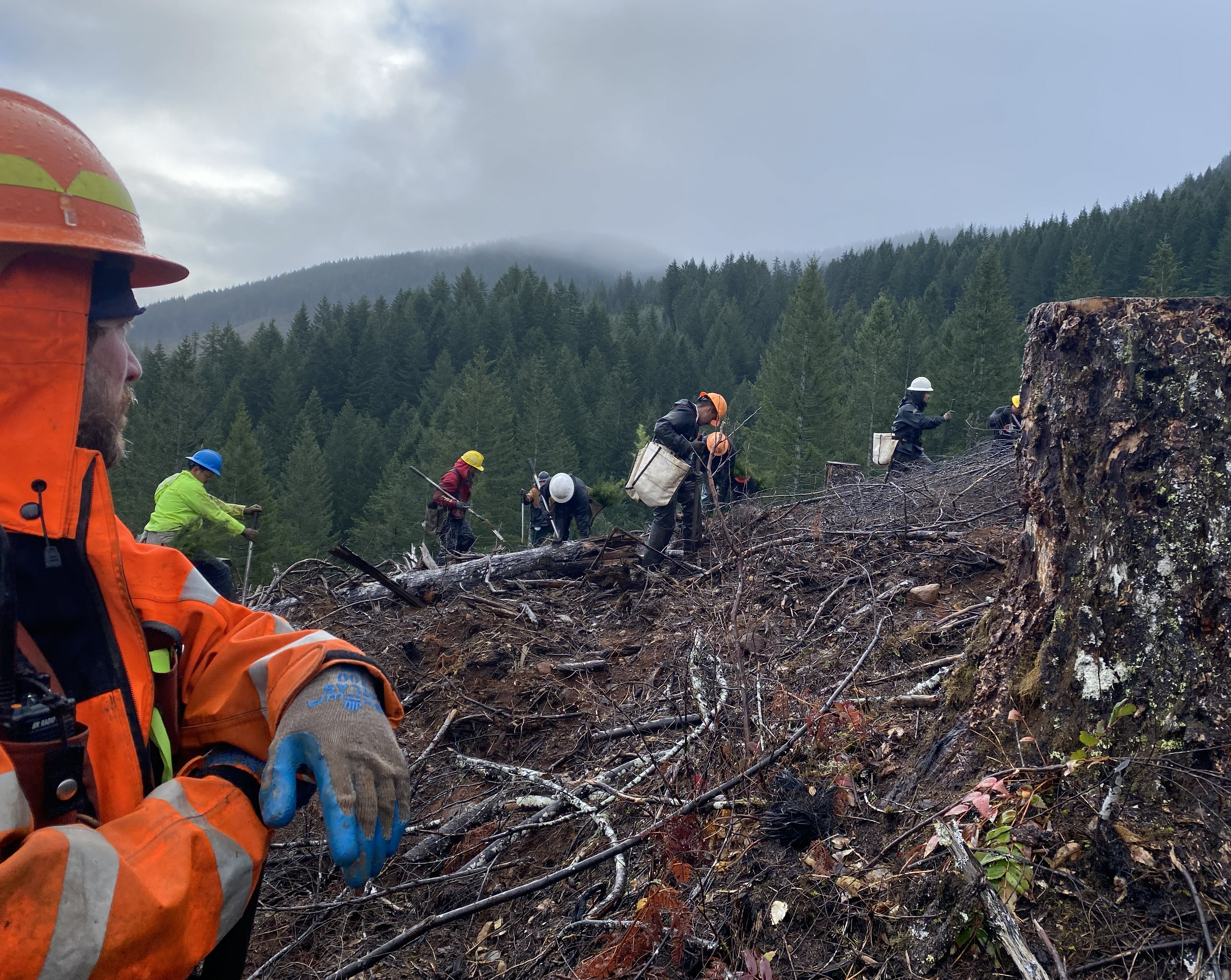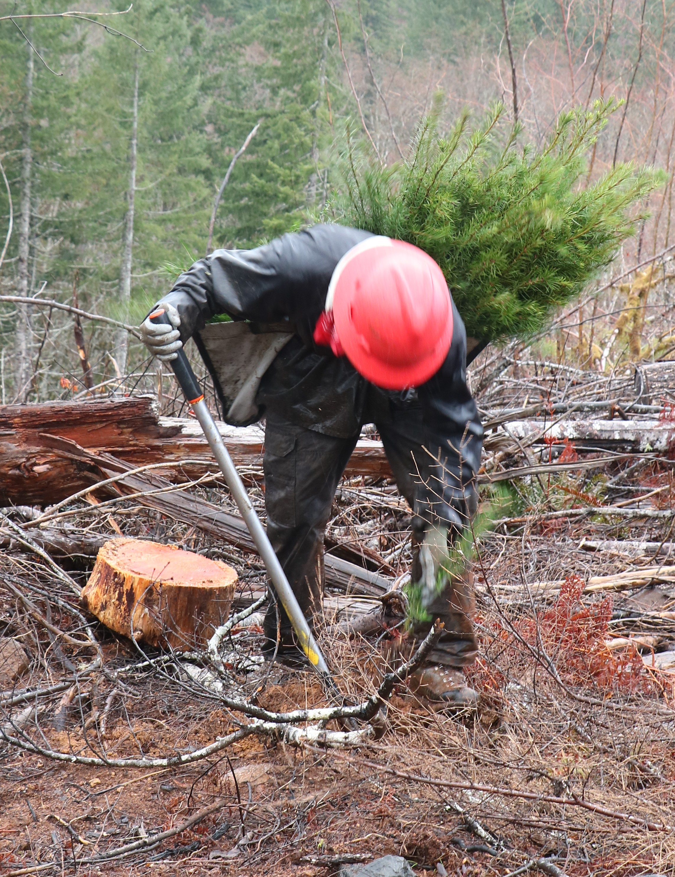 “This is not easy work,” said Bill Sayers, Reforestation Forester for ODF’s Forest Grove District who along with two of his coworkers were monitoring contractors working in Tillamook State Forest. “The terrain can be steep and slippery especially with a pack of 200 or so trees on your back and a shovel in your hand. Also, the contracts emphasize both speed and efficiency. They have to plant fast and plant correctly to get the maximum pay out specified in the contract. Most of these guys do amazing work.”